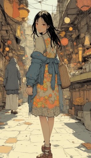 illustration art, anime, high school girl, candid shot, walking through Grand Bazaar, colorful patterned sundress, denim jacket tied around waist, leather sandals, carrying a woven straw bag, looking over shoulder with a playful grin, dynamic pose, bokeh effect from hanging Turkish lamps and colorful spices, full-body shot, vibrant marketplace atmosphere, long black hair flowing slightly, anatomical accuracy