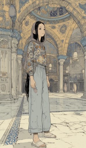 イスタンブールの象徴である**ブルーモスク(スルタンアフメト・ジャミイ)**を背景に、異国情緒あふれる空間に溶け込むような、上品で落ち着いた服装とポージングを表現します。モスクの荘厳な美しさと、少女の静かな雰囲気が対比的で印象的なシーンを目指します。