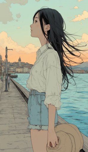 ヨーロッパとアジアを隔てるボスポラス海峡を望む、ガラタ橋付近の海辺をイメージしたシーンです。海風を感じる爽やかな服装と、開放的なポージングで、広大な景色を楽しむ旅行のクライマックスのような雰囲気を表現します。