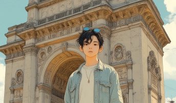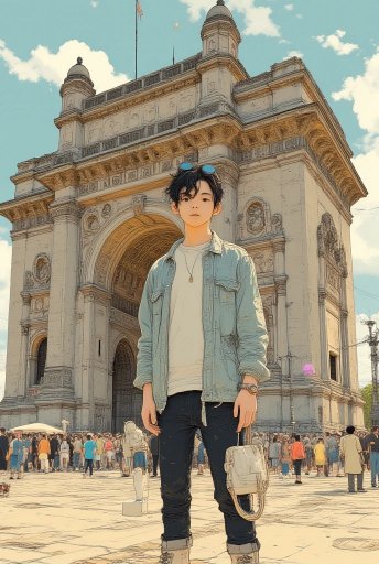 illustration art, anime, masterpiece, best quality, high quality, high resolution, small face, black hair, 1boy, solo, male focus, anime boy, salt face, cool expression, full body, **standing in front of the Gateway of India, bustling square, bright sunlight, detailed architecture of the monument**, **stylish light gray T-shirt, dark wash denim jacket, fitted black jeans, high-top sneakers, trendy sunglasses on his head, wrist watch, confident pose, one hand holding a camera strap, cinematic shot, realistic shading, vivid colors, detailed background crowds**