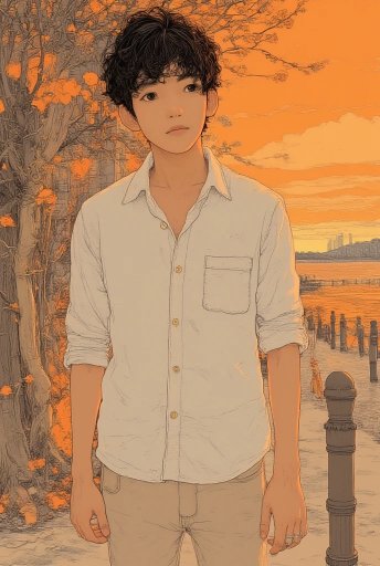 illustration art, anime, masterpiece, best quality, high quality, high resolution, small face, black hair, 1boy, solo, male focus, anime boy, salt face, gentle smile, full body, **walking along the waterfront, enjoying the sea breeze, Marine Drive (Queen's Necklace) in Mumbai, sunset glow, warm lighting, deep orange sky, soft focus on the background**, **white linen shirt, rolled up sleeves, casual beige linen pants, minimalist silver ring, relaxed pose, natural hair style, looking towards the horizon, cinematic shot, realistic shading, detailed fabric texture**