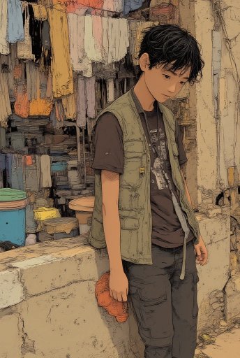 illustration art, anime, masterpiece, best quality, high quality, high resolution, small face, black hair, 1boy, solo, male focus, anime boy, salt face, thoughtful expression, upper body shot, **leaning on a low wall, looking down, in the background are colorful hanging clothes and laundry tubs, Dhobi Ghat in Mumbai, afternoon light, high contrast**, **loose fitting khaki utility vest, simple dark brown t-shirt, dark cargo pants, short messy hair, detailed texture of the wall, slightly dusty atmosphere, looking away from the viewer, realistic shading, cinematic shot**