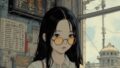 illustration art, anime, high school girl, leaning against vibrant graffiti wall, location Wynwood Walls Miami, **cropped graphic t-shirt**, **high-waisted ripped black jeans**, **chunky sneakers**, **small neon fanny pack across chest**, **pigtails with bright scrunchies**, **confident pose with one hand adjusting glasses**, **slight smirk**, full-body portrait, looking at viewer, detailed wall art, neon accents, anatomically correct