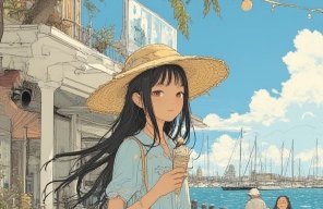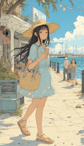 illustration art, anime, high school girl, standing on boardwalk at Bayside Marketplace, yachts and bay in background, **light blue sundress with floral pattern**, **straw hat dangling by ribbon**, **woven tote bag filled with souvenirs**, **simple flat sandals**, long black hair flowing in the breeze, **soft smile**, **candid pose holding a small ice cream cone**, upper-body to full-body, warm afternoon light, anatomically correct