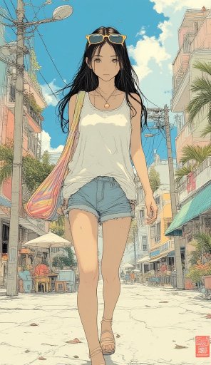 illustration art, anime, high school girl, walking down Ocean Drive, background of pastel Art Deco buildings, **white oversized tank top**, **short denim shorts**, **colorful striped towel bag slung over shoulder**, **sunglasses perched on head**, **strappy sandals**, wind in long black hair, **dynamic stride pose**, looking straight ahead, full-body portrait, bright sun light, anatomically correct